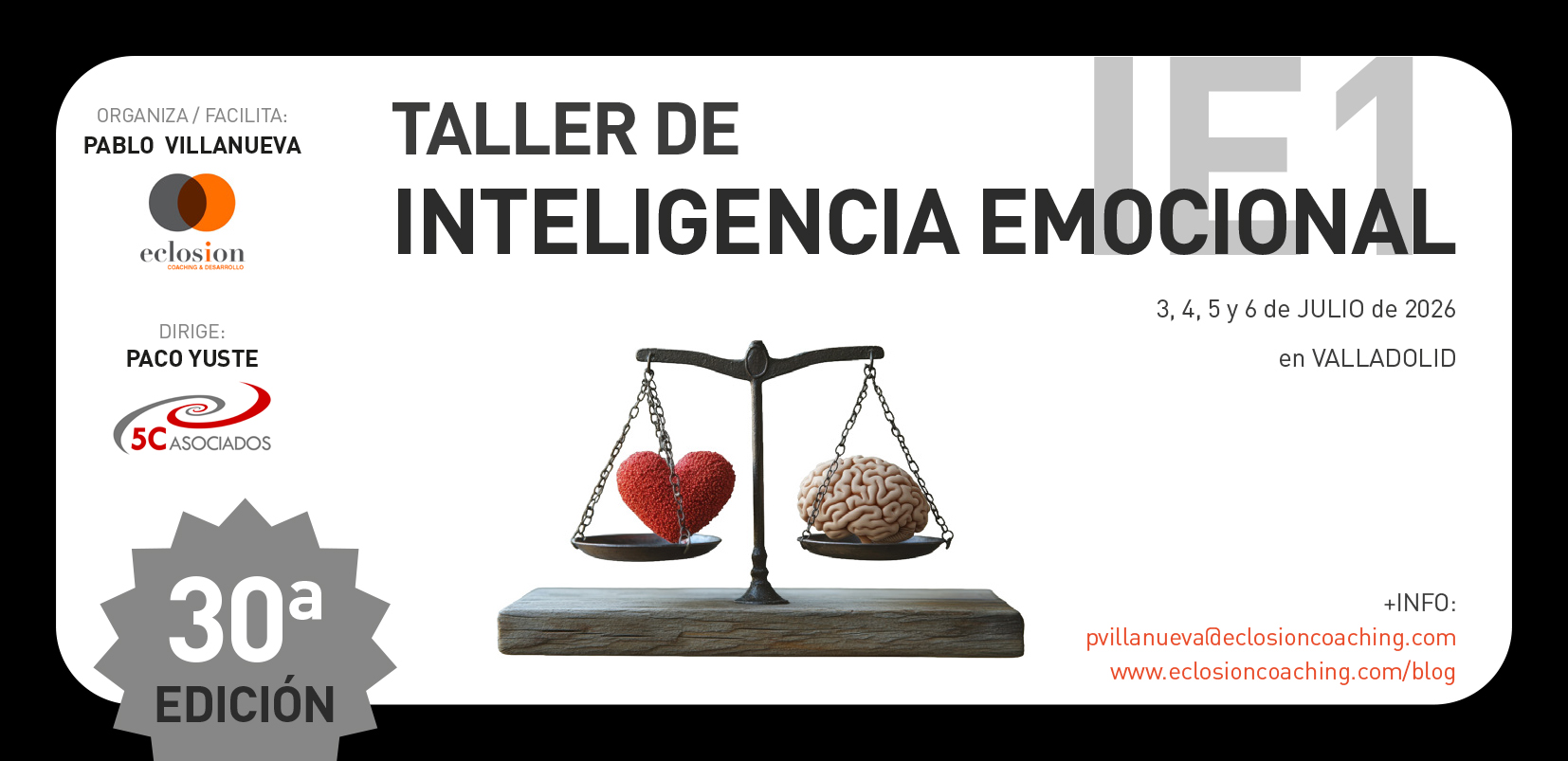 ¿Alguna vez has sentido miedo, pena, asco, cabreo…? Cada emoción cumple una función, pero no siempre sabemos recoger la información que nos aporta. ¿Sabes cómo gestionar las emociones en tu beneficio, respetándote y respetando a los demás? Desde hace doce años venimos convocando la posibilidad de cursar en Valladolid este Taller de Inteligencia Emocional (IE1), impulsado desde las premisas planteadas por Paco Yuste.